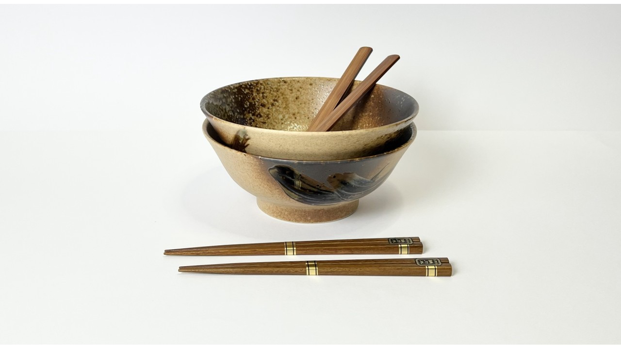 Questo Set Ramen include: 2 ciotole per ramen, 2 paia di bacchette e 2 cucchiai.